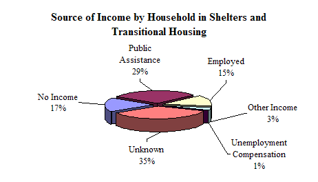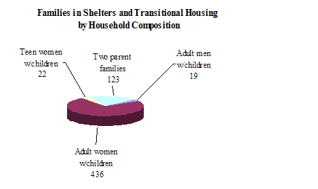 · The number of households in shelters and transitional housing programs included 600 families (defined as one or more adults with one or more children). The majority of children were with their mother or other female caretaker (76%), some were with both parents or two caretakers (20%), and a few were with their father or male caretaker (3%).