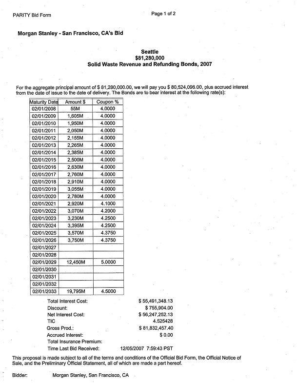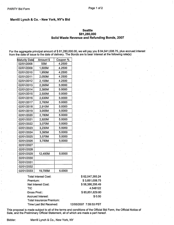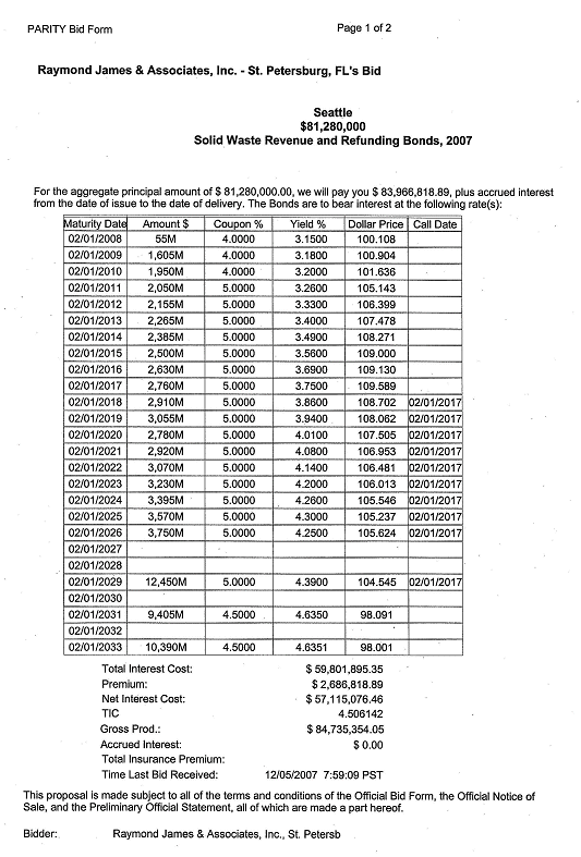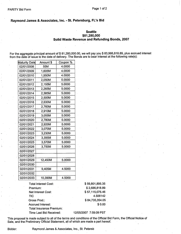 obligations and the use and application of money derived from those obligations; authorizing the purchase of Reserve Insurance to satisfy the Reserve Requirement; and ratifying, confirming and approving the notice of bond sale and the actions of the Director of Finance relating to the sale of the bonds. WHEREAS, pursuant to Ordinance 118975 and Resolutions 29791, 29796 and 298906, The City of Seattle, Washington (the "City") issued its Solid Waste Revenue Bonds, 1999, and provided for the issuance of additional bonds having a lien and charge on the Net Revenue of the Solid Waste System on a parity of lien with those bonds ("Parity Bonds") upon compliance with certain conditions; and WHEREAS, pursuant to Ordinance 119648 and Resolution 30061 (together, the "Refunded Bond Legislation"), the City issued its Solid Waste Revenue Bonds, 1999, Series B, as Parity Bonds; and WHEREAS, pursuant to Ordinance 121940 (the "Refunding Bond Ordinance"), the City authorized the issuance and sale of solid waste revenue bonds for the purpose, among other things, of paying all or part of the costs of refunding the City's outstanding solid waste revenue bonds; and WHEREAS, pursuant to Ordinance 121254, as amended by Ordinance 121779 and 122263, the City authorized the issuance and sale of its Parity Bonds in the aggregate principal amount of $31,800,000 for the purpose, among other things, of paying a portion of the cost to carry out the Plan of Additions described therein, and, pending the issuance thereof, the issuance of its Solid Waste Revenue Bond Anticipation Note, 2003 (the "Bond Anticipation Note"); and WHEREAS, pursuant to Ordinance 122498 (together with the Refunding Bond Ordinance and Ordinance 121254, as amended by Ordinance 121779 and 122263, the "Authorizing Ordinances"), the City authorized the issuance of Parity Bonds in the aggregate principal amount of $50,200,000 for the purpose of providing all or a part of the funds with which to: (1) pay part of the costs of carrying out the plan of additions and betterments to and extensions of the solid waste system; (2) refund and retire the Bond Anticipation Note; (3) provide for the Reserve Requirement for the Parity Bonds authorized therein; and (4) pay the costs of issuing and selling the Parity Bonds authorized therein; and WHEREAS, the Authorizing Ordinances authorized the Director of Finance to conduct a public or negotiated sale of the Bonds and to recommend to the City Council for its approval by resolution the interest rates and other terms and matters relating to the Bonds consistent with the Authorizing Ordinances; and WHEREAS, pursuant to the Authorizing Ordinances, a preliminary official statement dated November 28, 2007 (the "Preliminary Official Statement") for the public sale of the Bonds has been prepared, an official notice of that sale (the "Notice of Bond Sale") was given, a revised official bid form for that sale was distributed, bids have been received in accordance with the Notice of Bond Sale, and the proposed sale of the Bonds to Raymond James & Associates, Inc. (the "Purchaser") has been recommended to the City Council for its approval with the interest rates and other terms of and matters relating to the Bonds set forth in this resolution; NOW, THEREFORE, BE IT RESOLVED BY THE CITY COUNCIL OF THE CITY OF SEATTLE, THE MAYOR CONCURRING, THAT: Section 1. Definitions. The meaning of capitalized terms used and not otherwise defined in this resolution shall be as set forth in the Authorizing Ordinances. "Acquired Obligations" means those Acquired Obligations (as such term is defined in the Authorizing Ordinances) purchased to accomplish the refunding of the Refunded Bonds as authorized by this Resolution. "Authorizing Ordinances" means, together, the Bond Ordinance and the Refunding Bond Ordinance. "Bond Anticipation Note" means the Solid Waste System Revenue Bond Anticipation Note, 2003 (Non-Revolving Line of Credit), authorized by Ordinance 121254, as amended by Ordinance 121779 and 122263, "Bond Insurer" means MBIA Insurance Corporation. "Bond Ordinance" means, together, Ordinance 122498 of the City and Ordinance 121254 of the City, as amended by Ordinance 121779 and 122263. "Bonds" means the bonds authorized by the Bond Ordinance "Refunded Bond Legislation" means Ordinance 119648 and Resolution 30061 of the City. "Refunded Bonds" means those Solid Waste Revenue Bonds, 1999, Series B identified in Exhibit A. "Refunding Bond Ordinance" means Ordinance 121940 of the City. "Refunding Plan" means: (a) the deposit with the Refunding Trustee of Bond proceeds (and other money of the City, if necessary) sufficient to acquire the Acquired Obligations in the amounts necessary to carry out the refunding of the Refunded Bonds as described below; (b) the payment of the interest on the Refunded Bonds when due up to and including November 1, 2009, and the call and payment and redemption on November 1, 2009, of all of the outstanding Refunded Bonds at a price equal to 101% of the principal thereof; "Refunding Trust Agreement" means the Refunding Trust Agreement between the City and the Refunding Trustee relating to the Refunded Bonds, substantially in the form attached hereto as Exhibit F. "Refunding Trustee" means U.S. Bank National Association, serving as trustee or escrow agent or any successor trustee or escrow agent. "Reserve Insurance Policy" means the Municipal Bond Debt Service Reserve Insurance Policy issued by the Bond Insurer to provide Reserve Insurance with respect to the Parity Bonds. Section 2. The Bonds. The Bonds shall be issued in the aggregate principal amount of $82,175,000 and shall be called "The City of Seattle, Washington, Solid Waste Revenue and Refunding Bonds, 2007." The Bonds shall be in the denomination of $5,000 or any integral multiple thereof within a single maturity; shall be dated their date of initial delivery to the Purchaser; shall be registered as to both principal and interest; and shall bear interest f